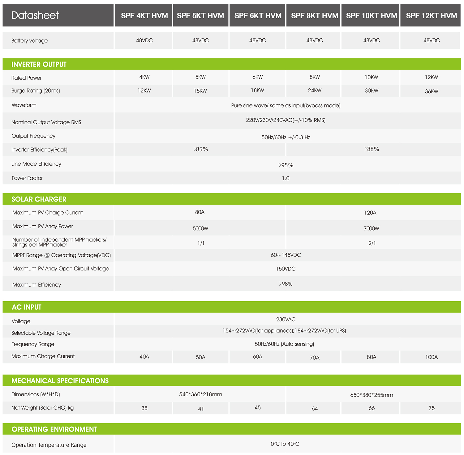 Biến tần năng lượng mặt trời dạng lưới Growatt SPF 4000-12000T HVM được tích hợp với bộ điều khiển sạc năng lượng mặt trời MPPT, Thiết kế biến áp cung cấp chuyển đổi năng lượng đáng tin cậy trong kích thước nhỏ gọn.