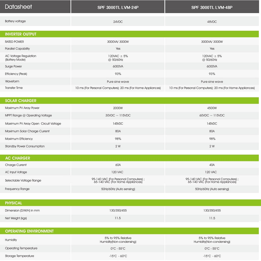 Biến tần Growatt SPF 3000TL LVM có biến tần đầu ra sóng hình sin thuần túy cũng chỉ dành cho hệ thống cung cấp điện 120VAC.Nó là hoàn hảo cho các ứng dụng ngoài lưới, điện dự phòng và các ứng dụng tự tiêu thụ.